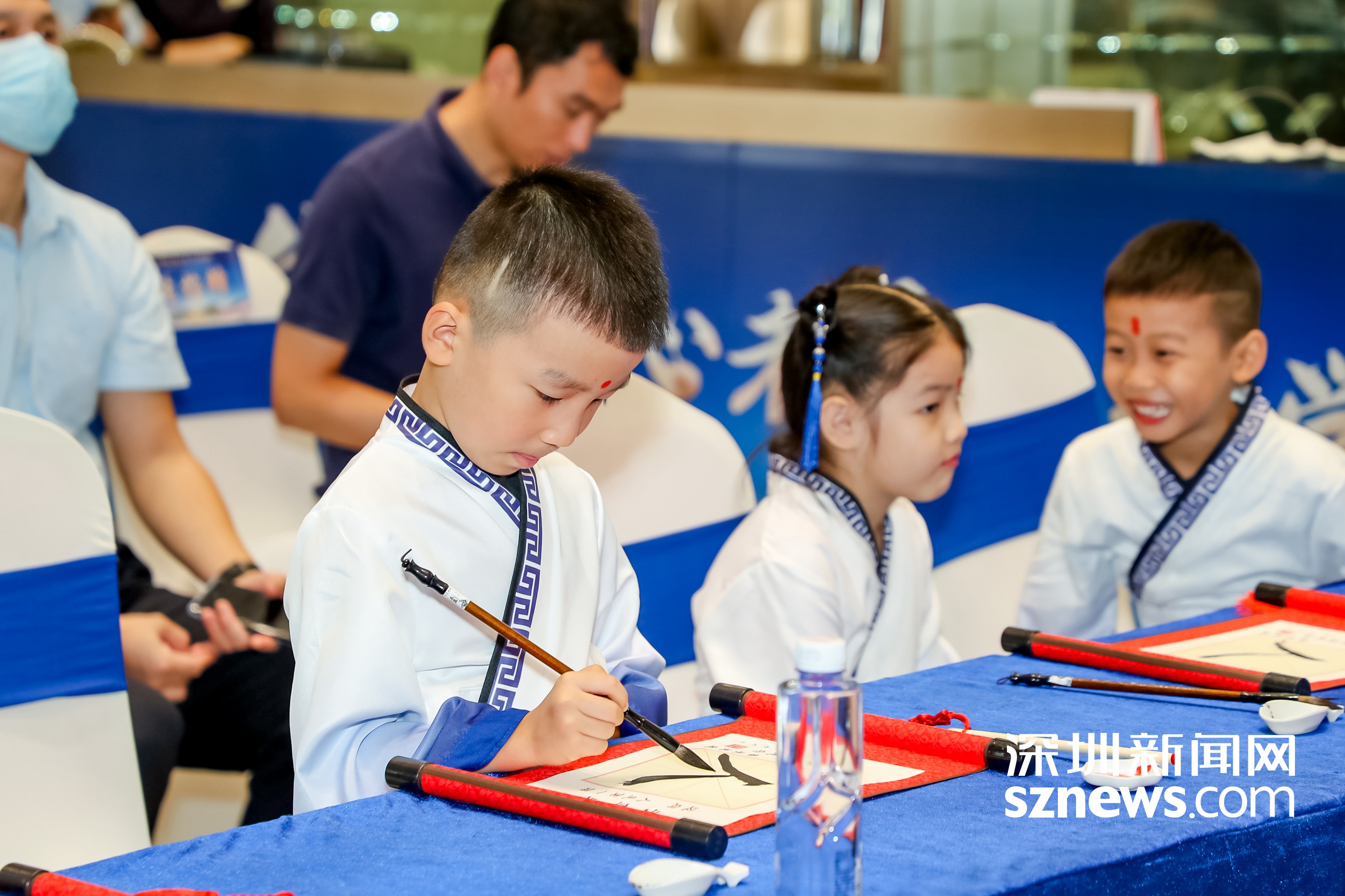 开学典礼上,华附联盟及星河小学的老师们带来了精彩纷呈的表演,新教师庄严宣誓将以奋斗者的姿态赶超奔跑,做不负光明教育的追梦人。怀揣着对中华民族传统文化的敬畏之心,现场还举行了新生开笔礼启蒙仪式。开笔仪式主要包括三个环节,敬拜先师、朱砂启智和启蒙描红。在座全体学子,首先面向先师孔子行礼,行礼后与会领导和老师们用红色的朱砂在学子们的额头正中点上红痣,意为开启智慧。最后,与会领导和老师们握紧孩子右手,一起写下“人”字,勉励孩子们学做人,做好人,做一个对社会有贡献的人。