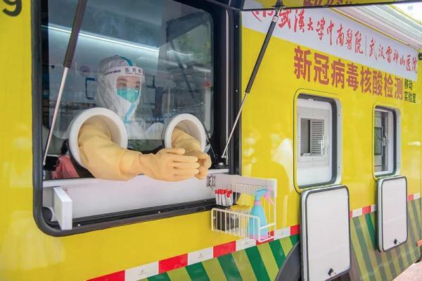 8月5日,来自武汉大学中南医院的移动核酸检测车驶入武昌区东湖路社区,为居民提供核酸检测服务。移动检测车通过“人工+机械”两种方式取样,在45分钟内就能出核酸检测结果,为武汉市全市全员核酸检测提供有力支持。