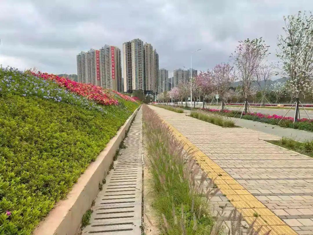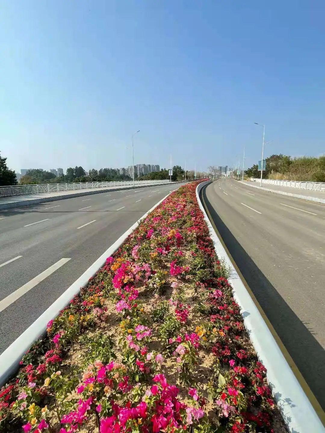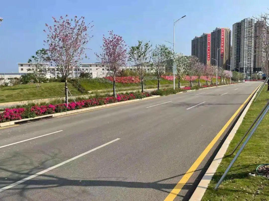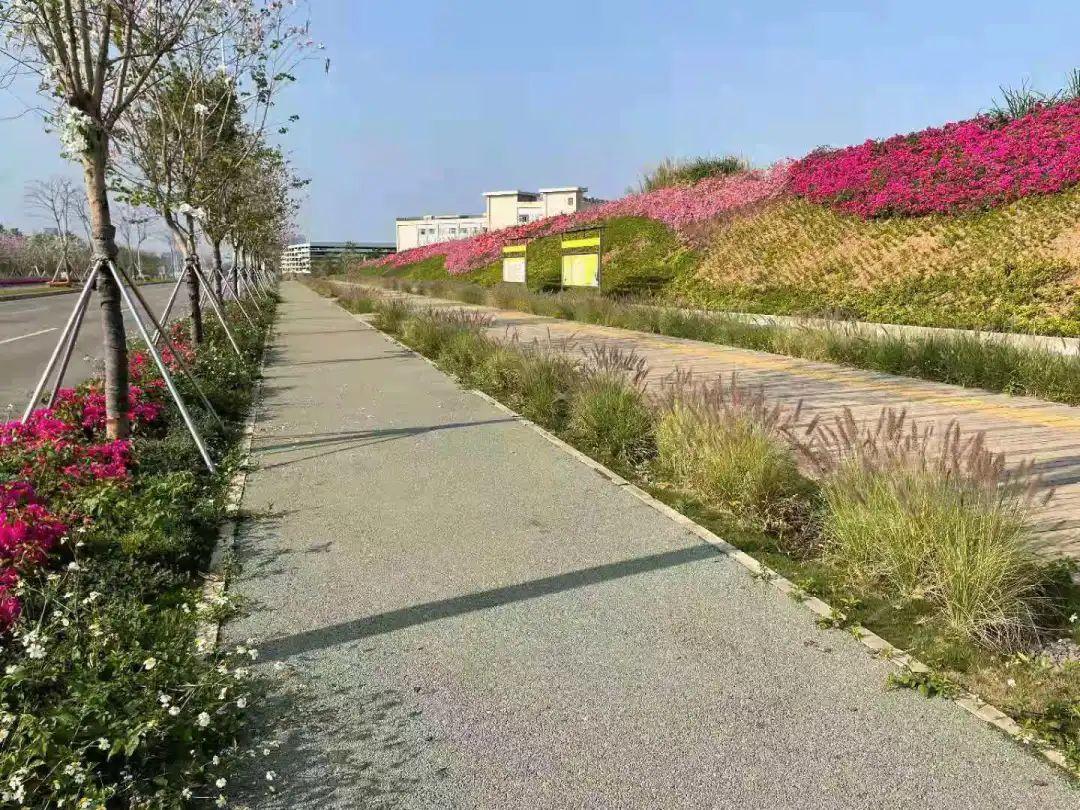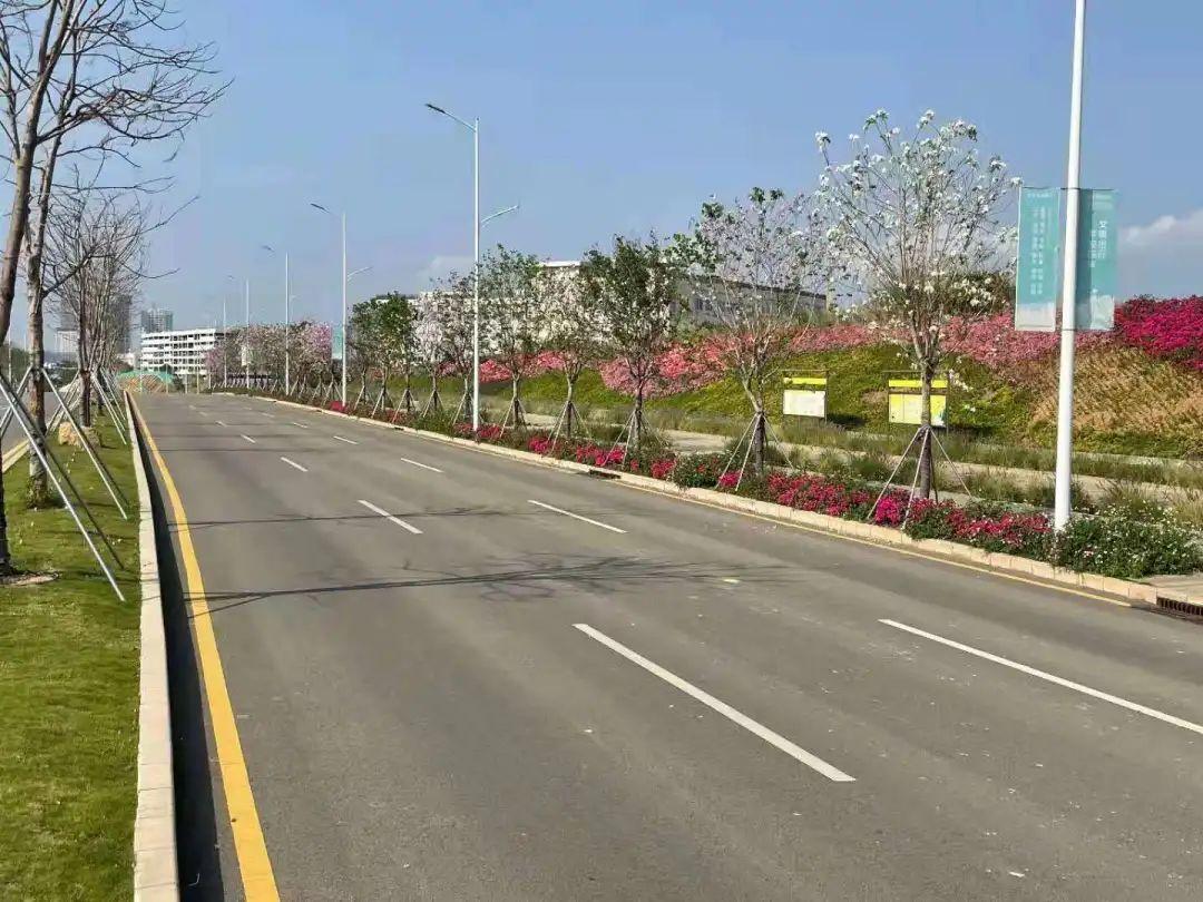 道路两侧种植凤凰木,中分带花灌木种植宫粉紫荆,提升道路景观,打造人行道的林荫效果。