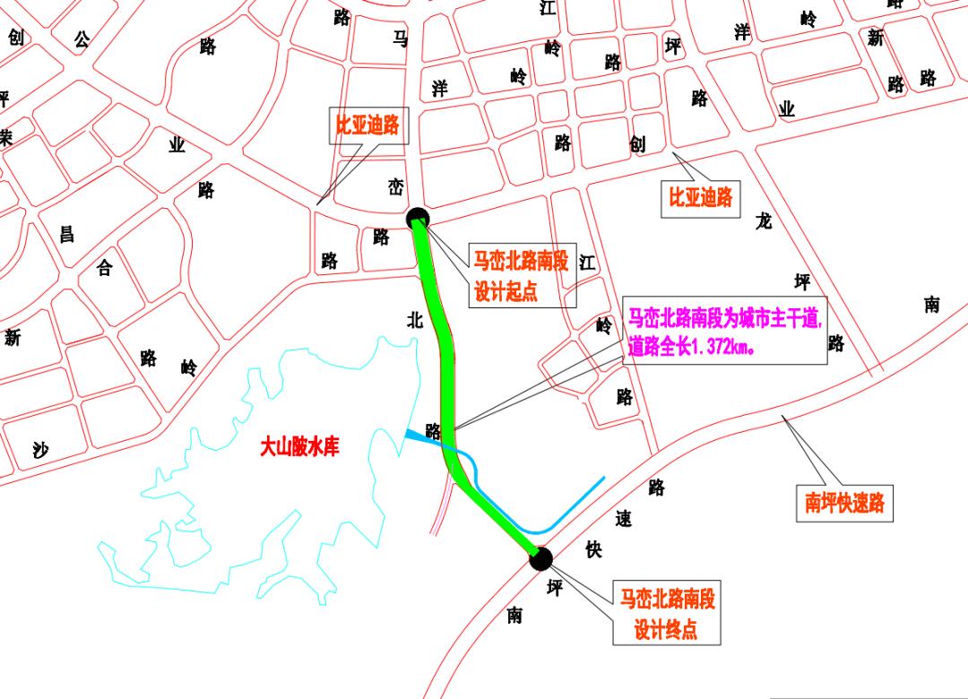 马峦北路南段道路工程路线大致呈南北走向,北起比亚迪路,南接南坪快速路马峦立交。