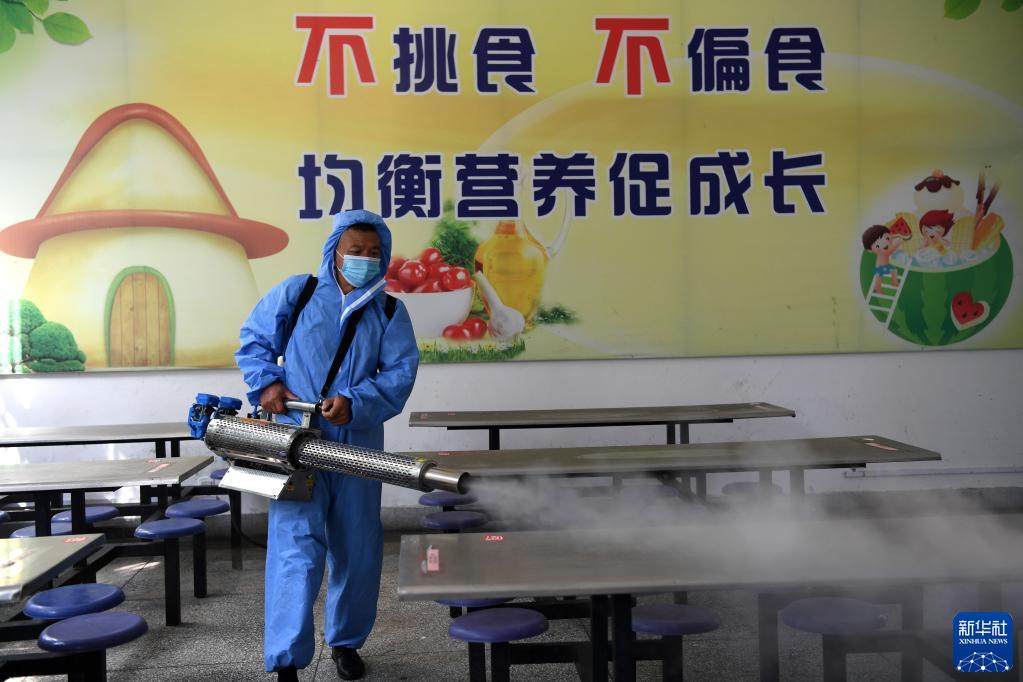 8月31日,在安徽省滁州市来安县水口镇中心学校,志愿者对学校餐厅进行消杀。