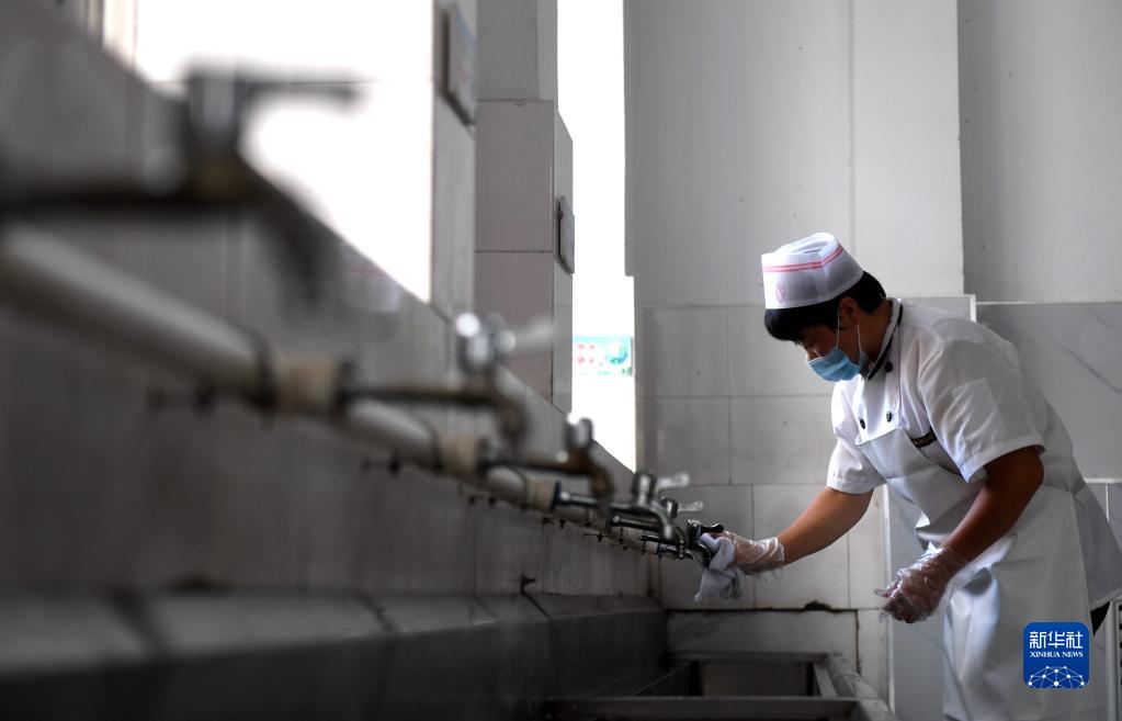 8月31日,工作人员在河北省永清县第二中学食堂进行清洁消毒。
