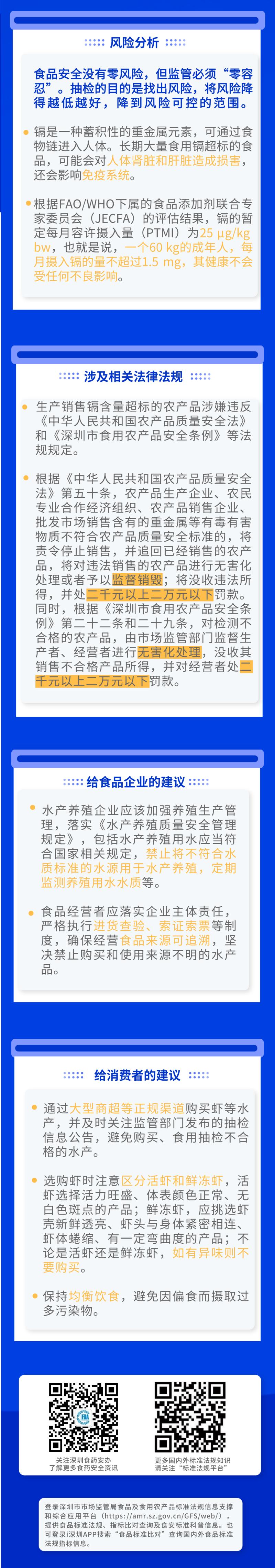 2021年7月22日至7月29日,根据市民投票情况,深圳市市场监管局组织市计量质量检测研究院和市质量安全检验检测研究院对深圳市10个行政区域34个街道52家经营单位共53批次水产品进行了抽样检验,包含淡水虾36批次,海水虾16批次,海水鱼1批次,检出不合格样品1批次。