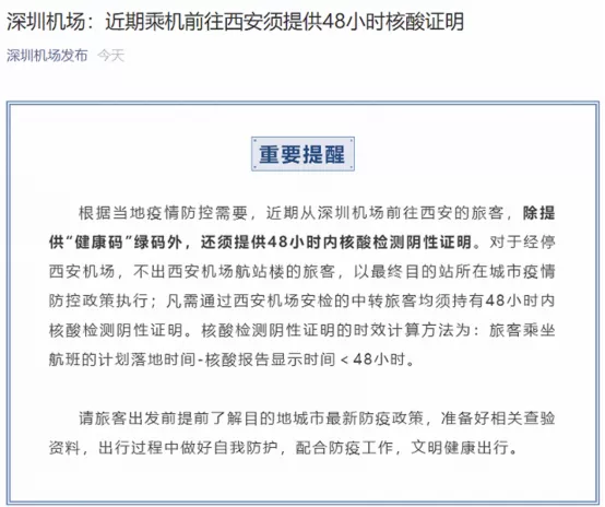 近期从深圳机场前往西安的旅客,除提供“健康码”绿码外,还须提供48小时内核酸检测阴性证明。