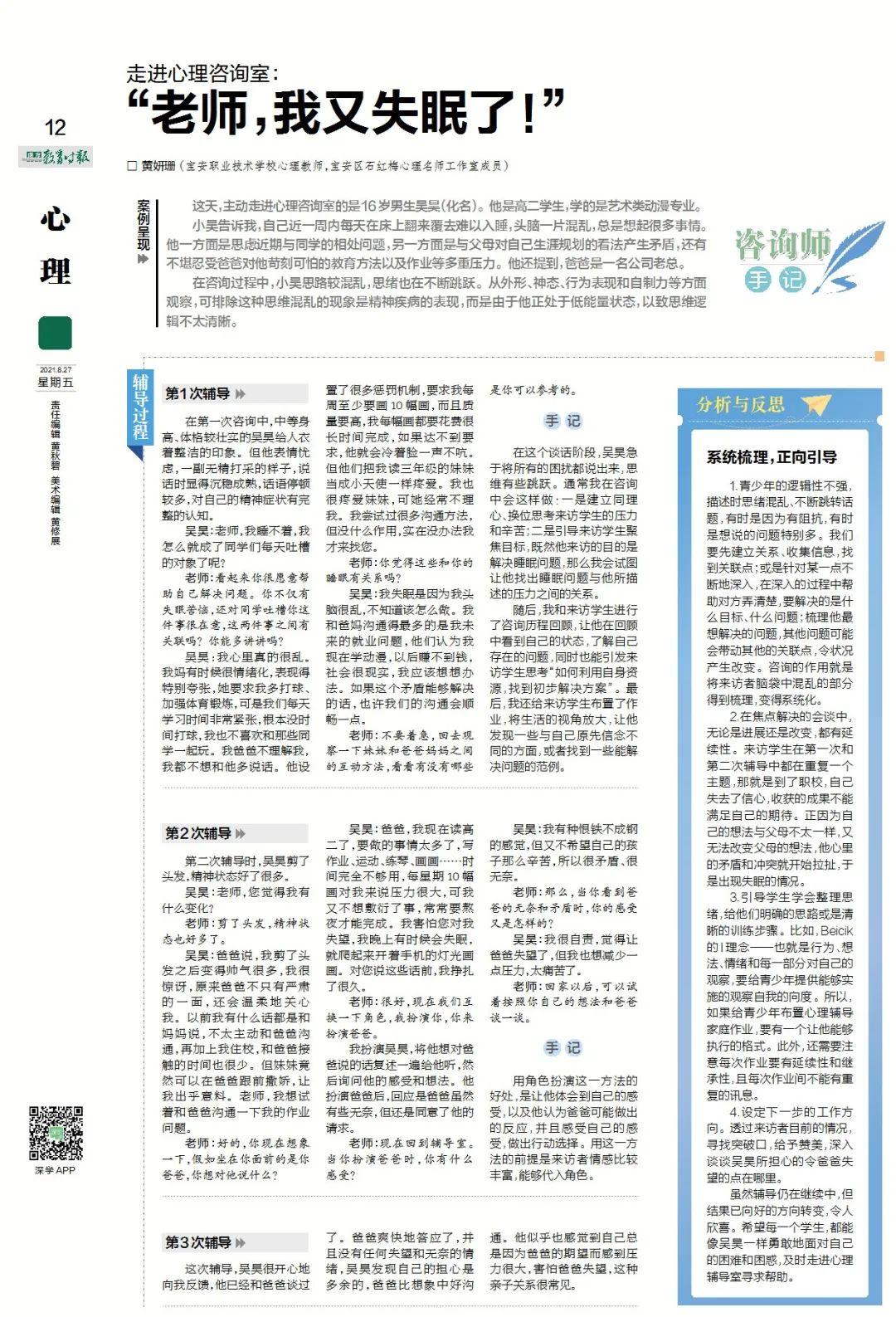虽然辅导仍在继续中,但结果已向好的方向转变,令人欣喜。希望每一个学生,都能像吴昊一样勇敢地面对自己的困难和困惑,及时走进心理辅导室寻求帮助。