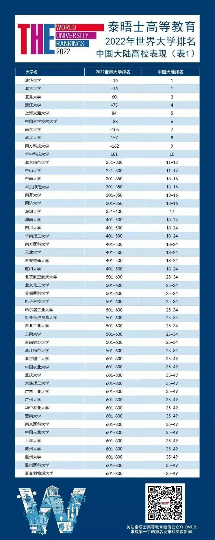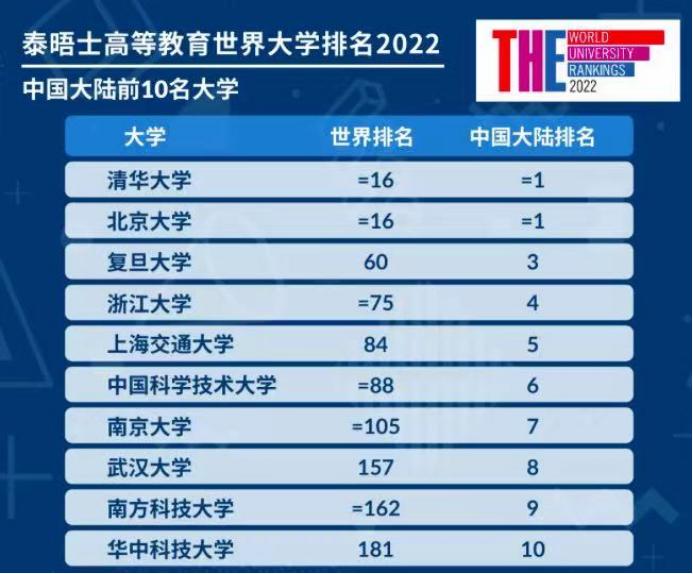 2021年9月2日,泰晤士世界大学排名网发布了最新“2022泰晤士高等教育世界大学排名”,南方科技大学(以下简称“南科大”)首次进入世界排名200强,位列第162位,在中国内地高校排名第9位。深圳大学位居中国内地高校第17,世界排名在351-400区间。
