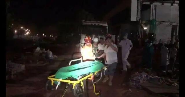 经过消防救援人员的紧张操作,成功完成营救后,受伤工人交由医护人员救治。