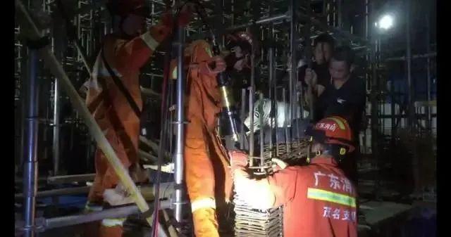 在了解现场情况后,指挥员迅速下令,由3名消防指战员密切协同配合对受伤工人其伤部进行固定及安全保护,再由另1名消防指战员使用液压剪切器对钢筋进行切割,把受伤工人和钢筋安全分离开来。