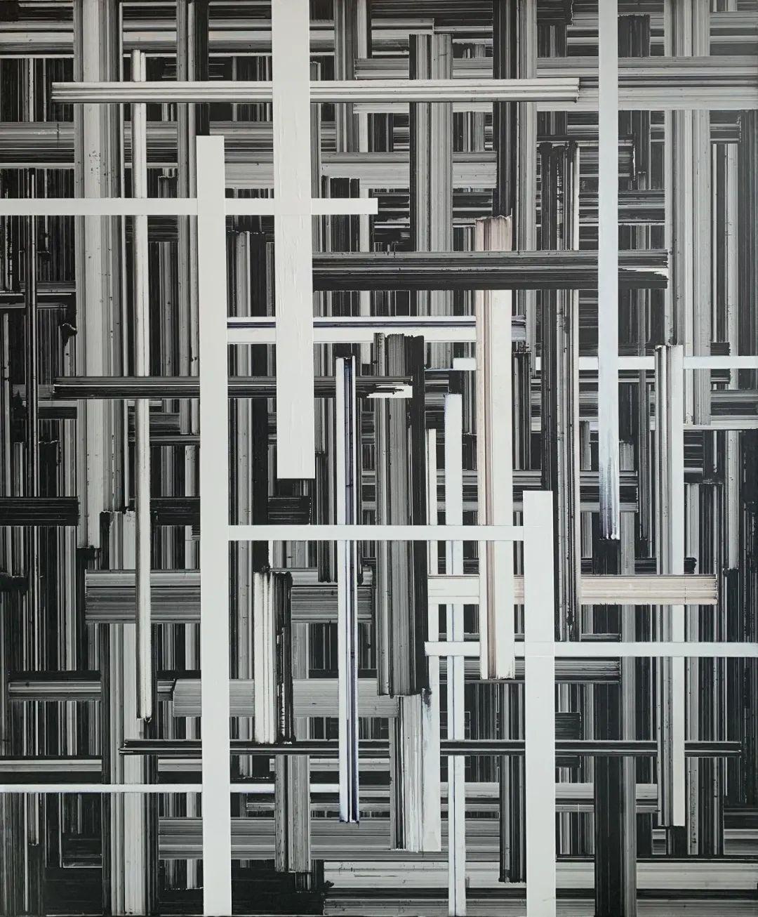 古鹏,重叠、片段、条状物2,布面针管笔,120×100cm,2021