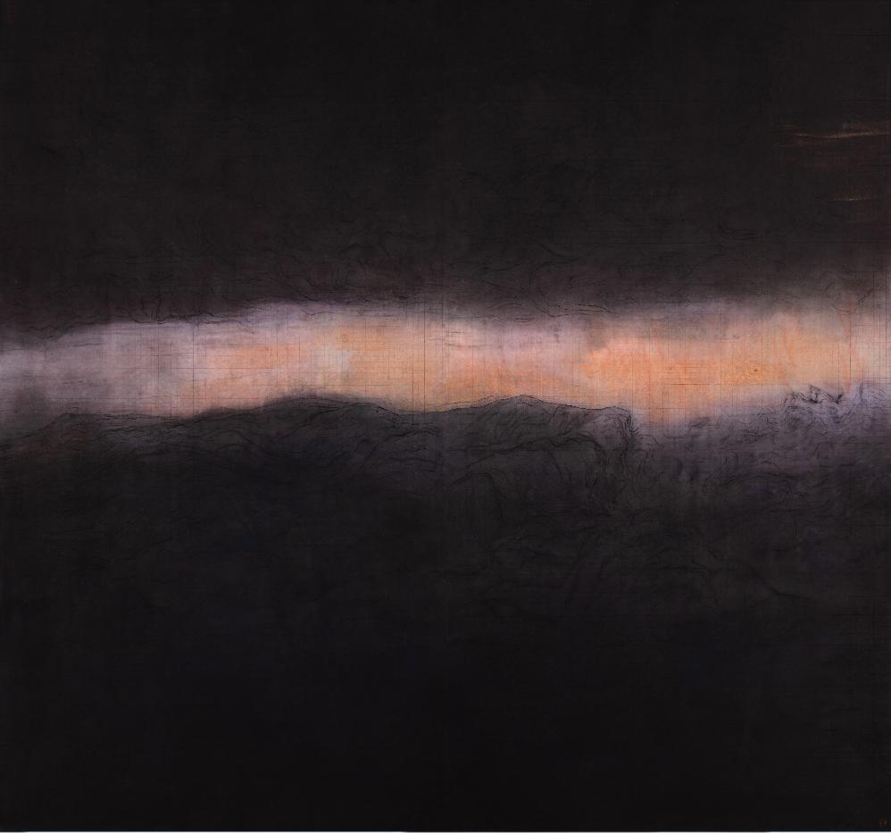 王绍强同样是身兼多职的艺术创作者,在策展人、美术馆馆长等多重身份背后,是其以岭南人的探索胆魄,从西北地质、山川生成出“知识地理考古”式的索引之路。从“后山”系列起,王绍强在对图像文献和古代地理的科学考察中,用水墨语言、网格状背景和地理性坐标联合搭建起“科学-史学-美学”的山水新体系。他希望“以世间万’象’为研究重点”,包括可见或不可见之象、心象或视象、星象、地象乃至画里画外的抽具象图象,包含一切灵感及体验的原生态语境。