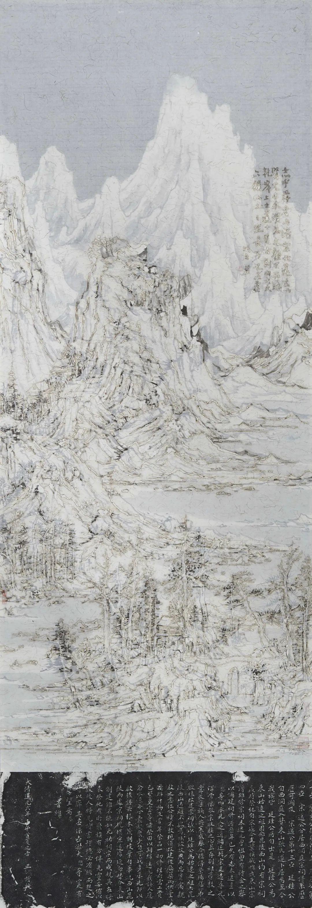 丘挺近期的作品尤为追求意象性的“境”和“域”的幽玄、绵远。或从真景的文史时空生发出某种遥远的、梦境般的精神对话与追忆;或直写胸中意象,垒造杳无定型的精神之碑。丘挺坚持“守正·创新”的演进路径,这与他“思古之请,求新之念”的个人情感相互叠合。他对传统绘画的细腻精微、沉雄浑茫反复摩挲,也对真景造化所传递给人的法外之想体认不迭。在时代的纷扰和价值体系空前的零碎面前,丘挺希望从胸怀内在的澄净出发,开放却不随波逐流地探寻“真”的价值。