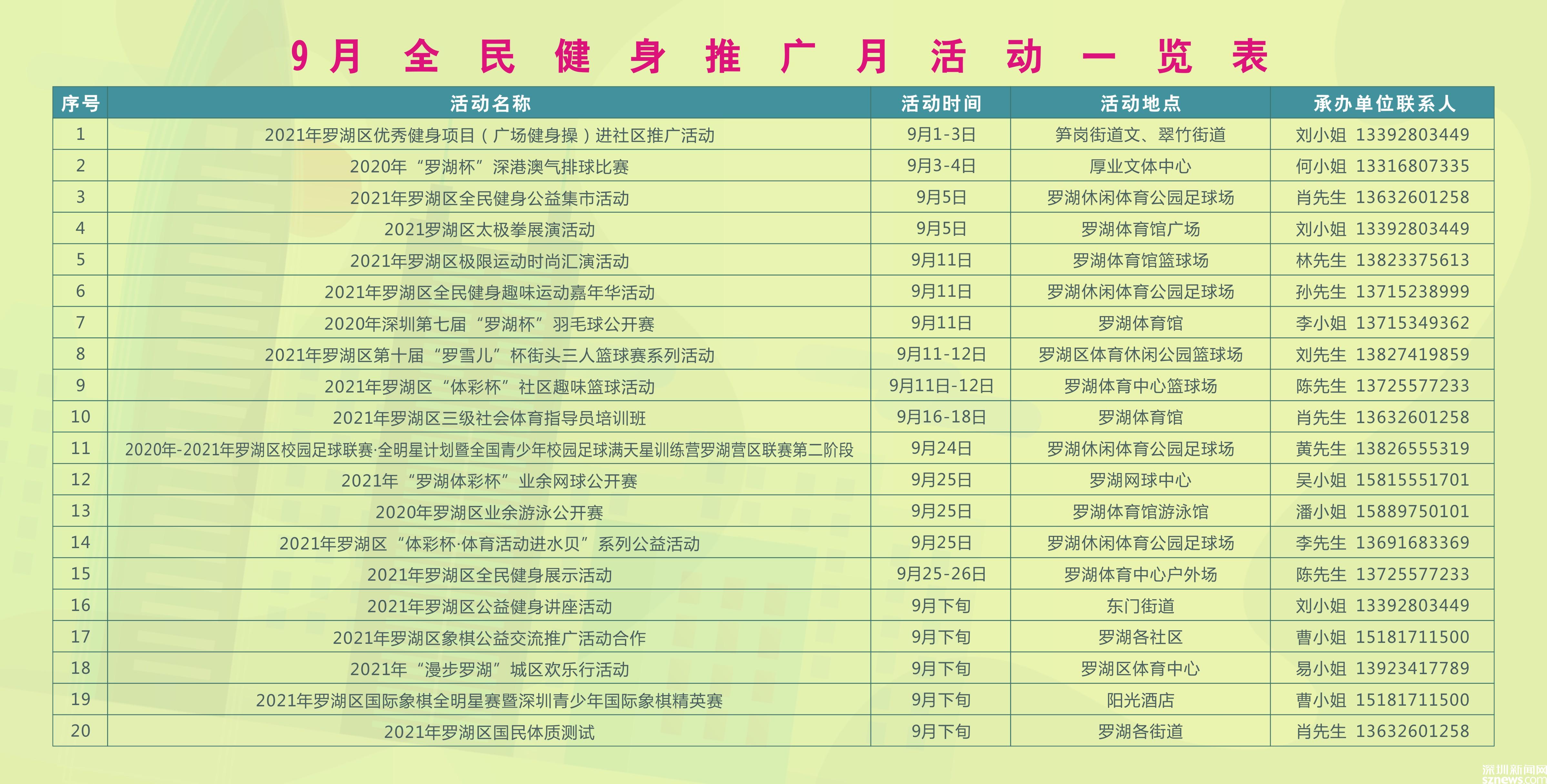 据了解,罗湖区将在9月全民健身推广月组织承办极限运动时尚汇演、全民健身趣味运动嘉年华、街头三人篮球赛、羽毛球公开赛等共二十项全民健身活动,市民可以在罗湖区文体场馆“一键预约”平台及时了解相关活动资讯,还可通过“报名”版块参与其中。同时为了鼓励更多的市民群众积极参与全民健身,罗湖区计划在全民健身推广月于 “一键预约”平台推出“400万元体育消费券”这一重磅福利,从2021年9月至12月向市民派发分15元、30元、100元三种面值的消费券,每周发放,有效期两周,市民通过罗湖区文体场馆“一键预约”平台可以抢券,体育消费券适用于罗湖体育馆、罗湖体育中心户外运动场、罗湖网球中心、罗湖室内网球馆、罗湖体育休闲公园的运动场租、门票、培训及体育用品等,为市民送来实实在在的惠民体育福利,让市民可以任意选择自己喜爱的运动项目进行消费。
