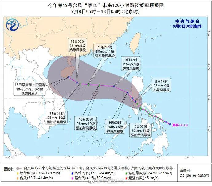9月6日14时,今年第13号台风“康森”(英文名:Conson;来源:越南;意义:古迹)生成。这是今年首个秋台风。9月8日8时,其中心位于菲律宾中部岛屿上(北纬13.6度、东经121.7度),中心附近最大风力30米/秒(11级),中心最低气压982百帕。