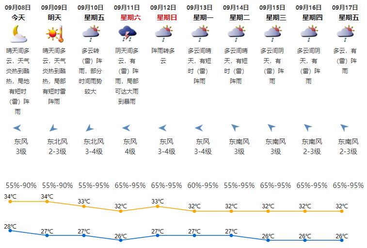 10-11日,受台风“康森”外围东到东南气流影响,转间歇性雷阵雨,局部可达大雨到暴雨,沿海、高地和海区最大阵风6-7级
