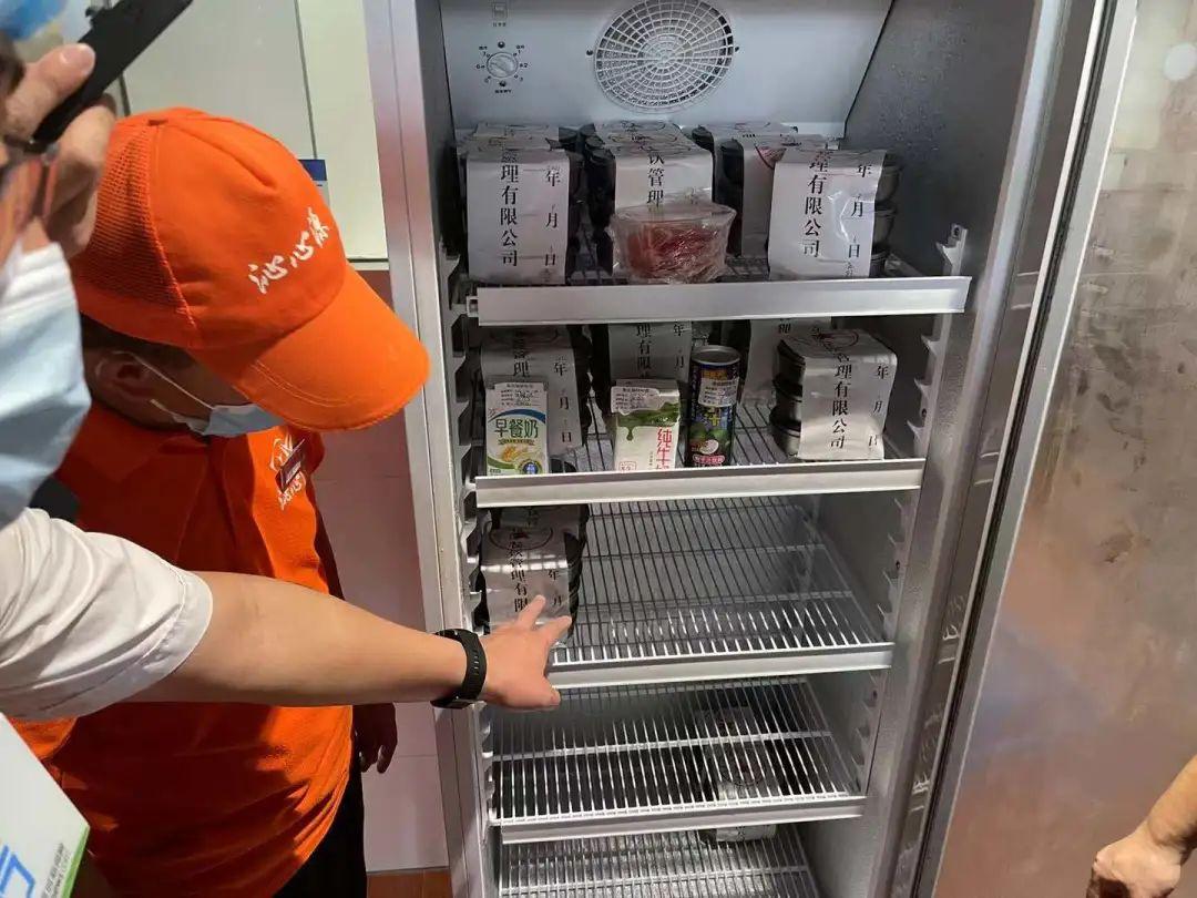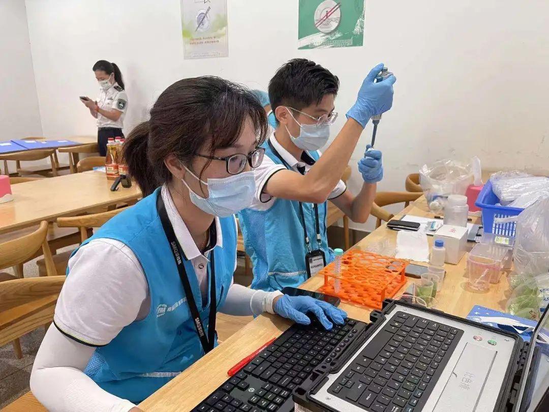 △“蓝马甲”现场对食堂的叉烧肉、食用调、油、油麦菜和生菜进行了快检,结果均为阴性