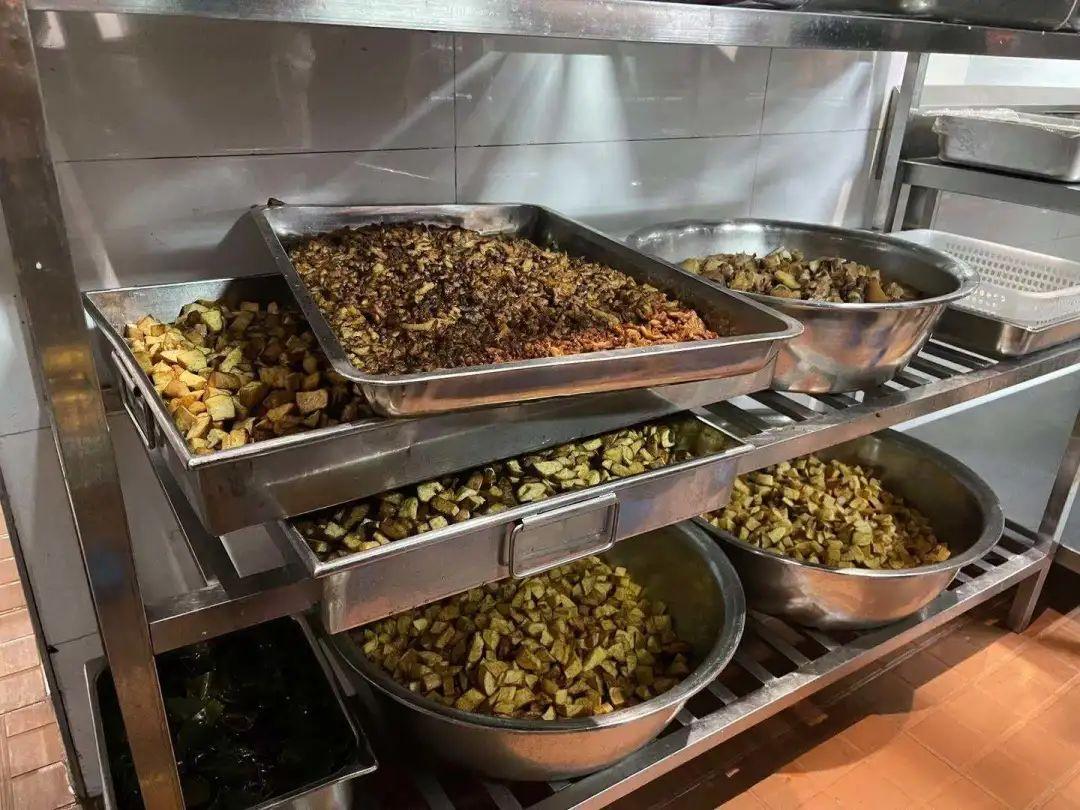 △操作间有待加工的半成品菜品,执法人员提示不要把菜品堆叠存放