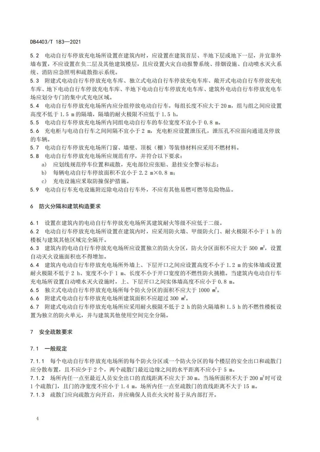 《规范》对场所的总平面布局、平面布置、防火分隔和建筑构造、安全疏散、消防设施和器材、电气、巡查等方面内容作出全面、具体的规定。例如,要求新建的公共建筑、住宅建筑应建设电动自行车停放充电场所;既有的公共建筑、住宅建筑应根据需要选择合适位置增设电动自行车停放充电场所。