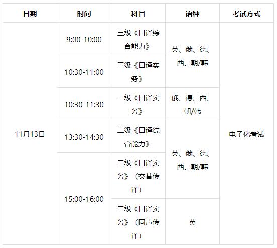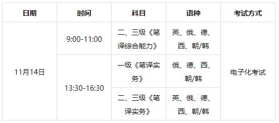 2021年下半年翻译考试设英语、俄语、德语、西班牙语、朝鲜语/韩国语等5个语种,英语分为二、三级,俄语、德语、西班牙语、朝鲜语/韩国语分为一、二、三级,各语种、各级别均设口译和笔译考试。