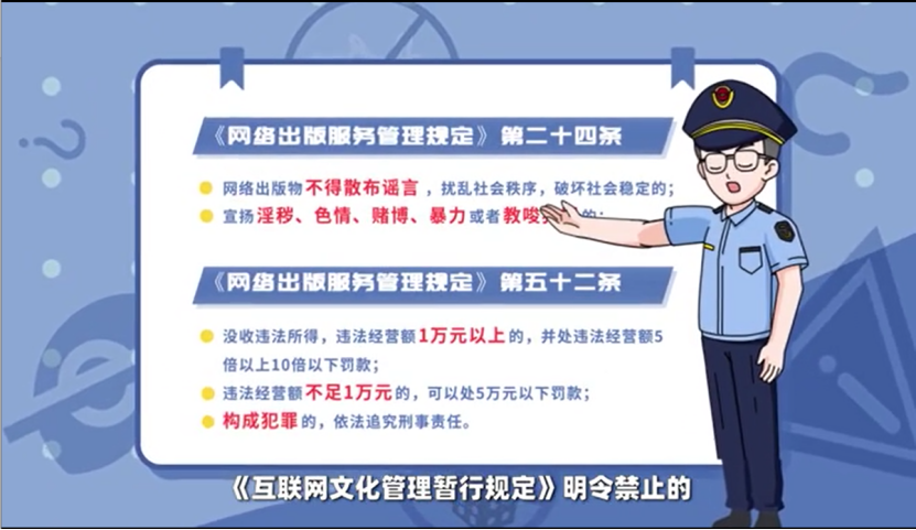 *出版、传播含有本规定第二十四条、第二十五条禁止内容的网络出版物的,根据《出版管理条例》第六十二条、《互联网信息服务管理办法》第二十条的规定,由出版行政主管部门责令删除相关内容并限期改正,没收违法所得,违法经营额1万元以上的,并处违法经营额5倍以上10倍以下罚款;违法经营额不足1万元的,可以处5万元以下罚款;情节严重的,责令限期停业整顿或者由国家新闻出版广电总局吊销《网络出版服务许可证》,由电信主管部门依据出版行政主管部门的通知吊销其电信业务经营许可或者责令关闭网站;构成犯罪的,依法追究刑事责任。