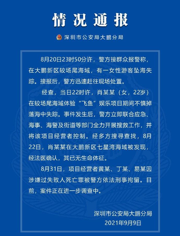 8月20日,警方接群众报警称在大鹏新区较场尾海域,有一女性游客坠海失踪。经查,当日22时许,肖某某在较场尾海域体验“飞鱼”娱乐项目期间不慎掉落海中失踪。经多方搜寻查找,8月22日,肖某某在大鹏新区七星湾海域被发现,经法医确认,其已无生命体征。8月31日,项目经营者黄某、丁某、易某因涉嫌过失致人死亡罪被警方依法刑事拘留。目前,案件正在进一步调查中。
