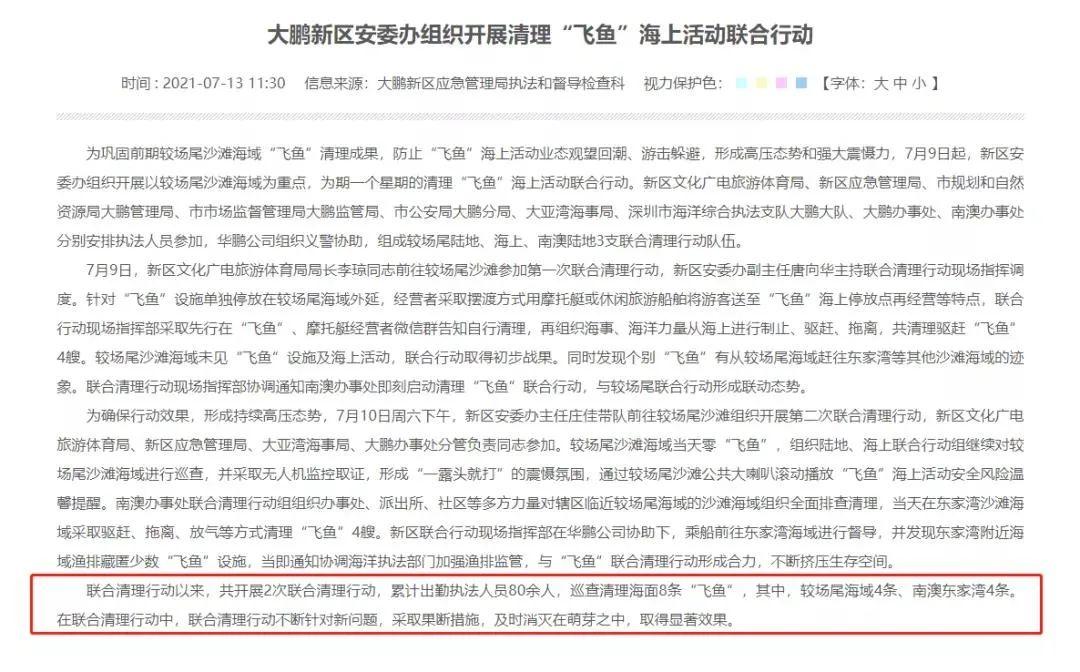 2021年7月13日,大鹏新区政府官网曾发布《大鹏新区安委办组织开展清理“飞鱼”海上活动联合行动》一文。