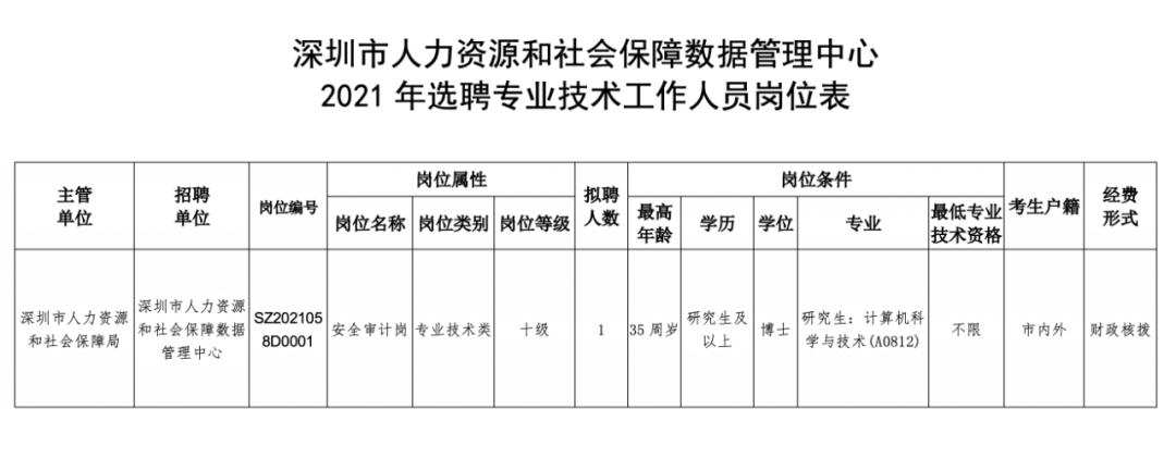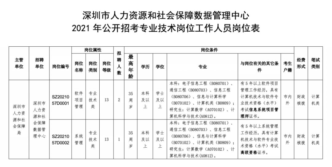 深圳市人力资源和社会保障数据管理中心2021年公开招考专业技术岗位工作人员公告