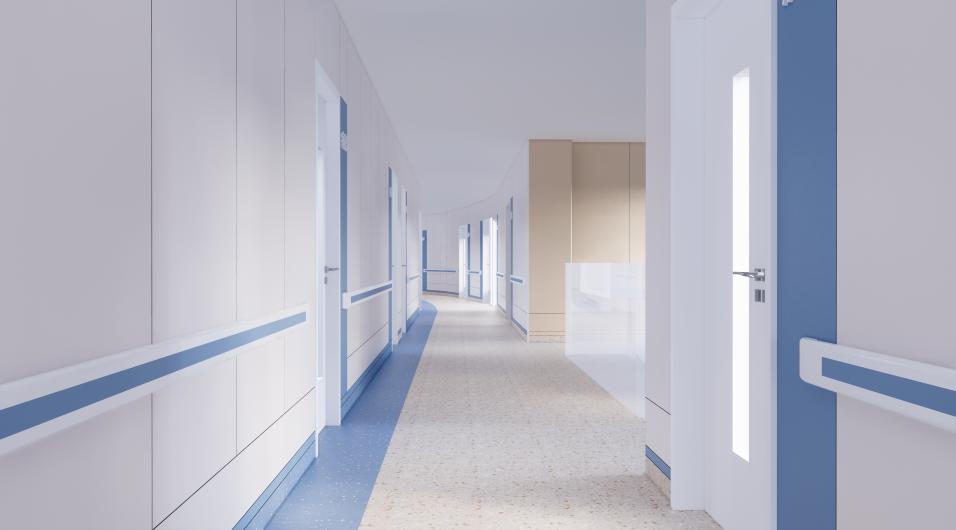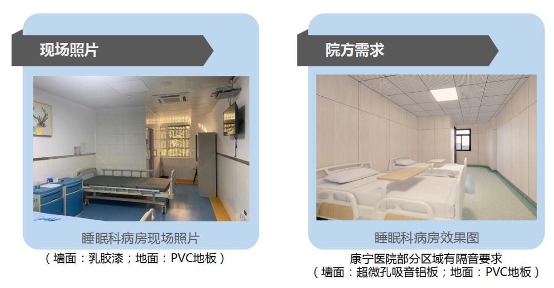 例如:康宁医院提出睡眠科病房需有吸音隔音功效,为具有睡眠障碍的患者提供安静的环境。此病房区域墙面则采用超微孔吸音板。