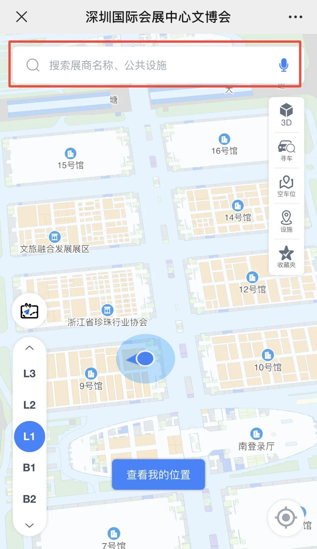 文博会馆内导航为您提供精准的展位导航功能。借助深圳国际会展中心多达27000个信号设备(持续增设),您在小程序搜索栏输入想要找的参展企业或目标展位的展位号时,便可获得高精度定位与清晰的线路指引,结果误差小于3米!