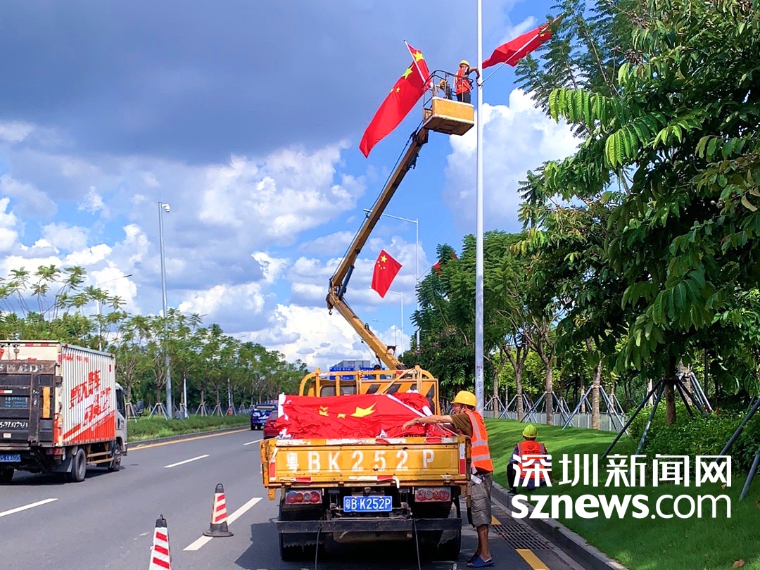 读特客户端·深圳新闻网2021年9月23日讯(记者 林秋颖 通讯员 余巍巍 叶海燕)9月23日,眼尖的群众经过周家大道马田街道路段时,看到一面面鲜艳的五星红旗整齐划一地悬挂在道路两侧的路灯灯杆上。红旗迎风飘扬,在蓝天白云的映衬下,“中国红”让人精神振奋,给城市增添了不少精气神儿。