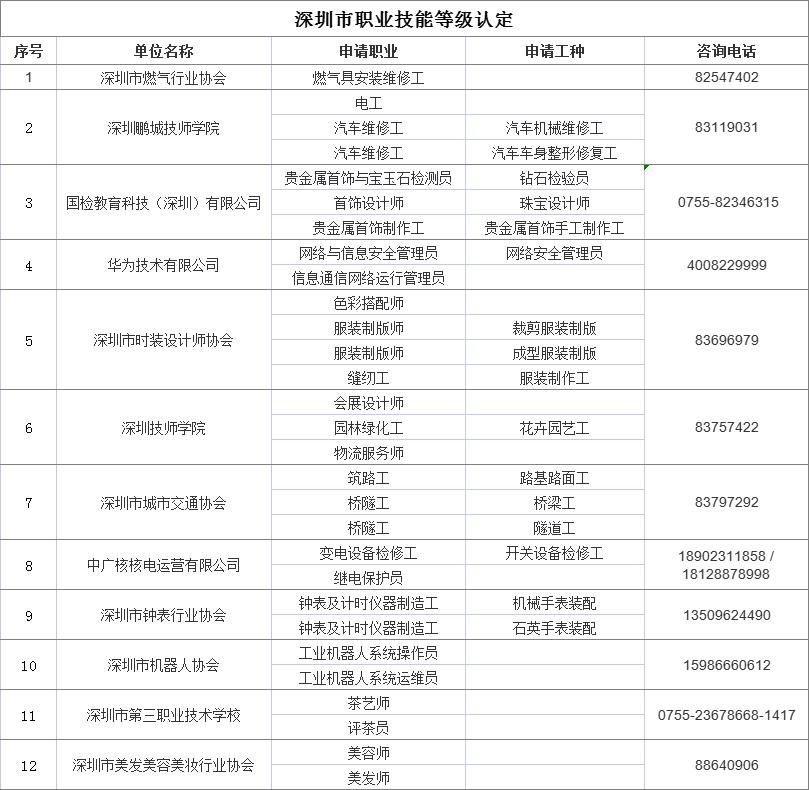 目前有以下12家社会培训评价组织可在深圳市范围内面向社会从业人员开展第三方评价,接下来会逐步开放更多!有关认定的具体问题可拨打下面的电话咨询哦!