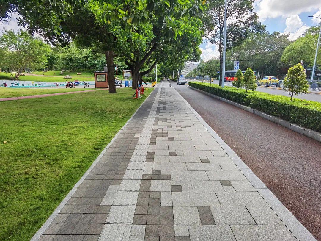 为融入公园的整体休憩环境,金岭路南侧人行道选用更贴合周边环境品质的芝麻灰与芝麻黑双色搭配花岗岩面砖铺筑。