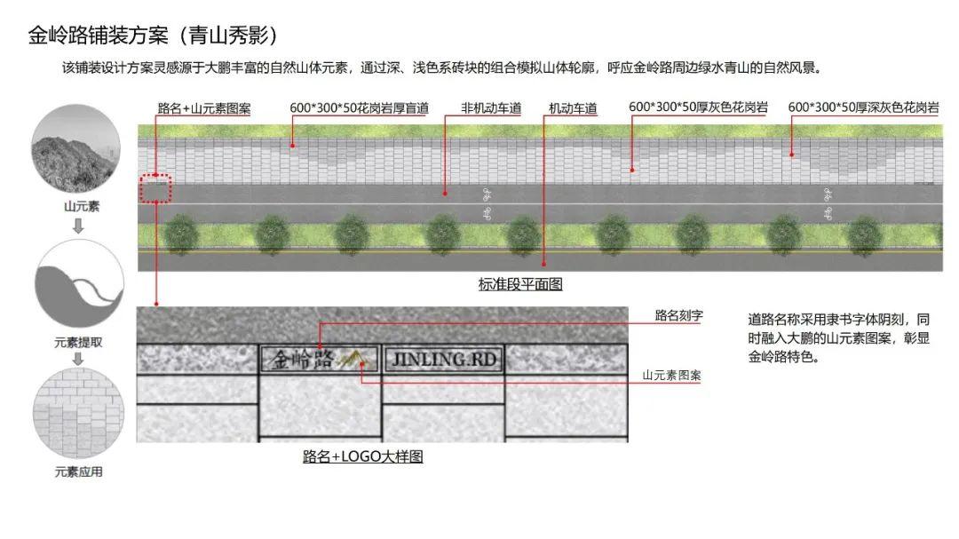 本次金岭路南侧人行道设计灵感来源于大鹏新区丰富的自然山体,拼铺概念来自绘画艺术中版画的明暗对比形式。