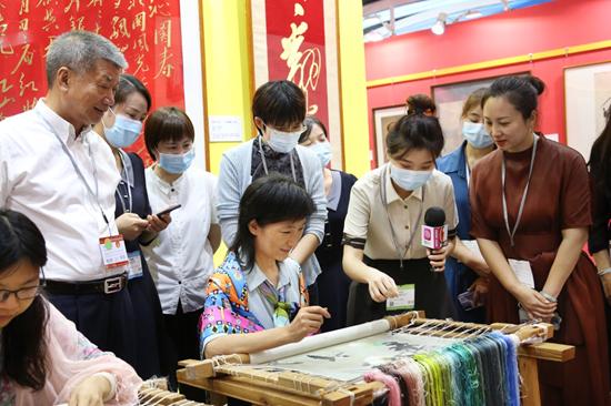 在210平方米的展览馆,一同展出的旗袍、丝巾、文创产品等其他作品设计新颖,色彩明亮,工艺精湛,引得众多市民拍照留念,还有很多市民对展览作品爱不释手,“丝绸”成了展馆内的热门词汇。