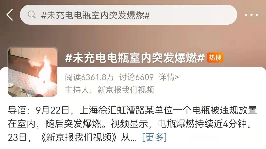 视频显示,9月22日早上,上海市徐汇区虹漕路68号锦和中心一家公司内,保洁阿姨将一个电动自行车电池违规放置在室内。过了没几分钟,电动自行车电池“嘭”的一声,冒起一团黑烟。