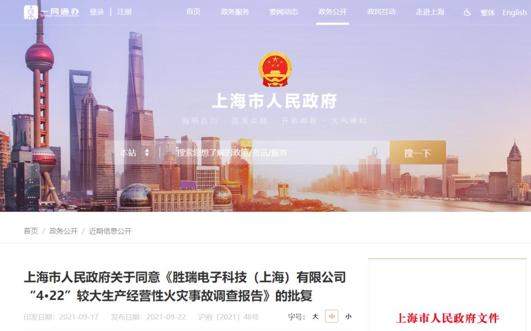 近日,上海市人民政府批复《胜瑞电子科技(上海)有限公司“4·22”较大生产经营性火灾事故调查报告》,经胜瑞电子科技(上海)有限公司“4·22”较大生产经营性火灾事故调查组(以下简称:事故调查组)认定,该起事故是一起责任事故。