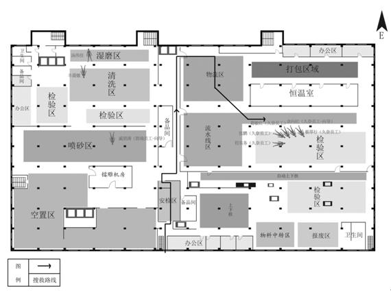 火灾扑救期间,胜瑞公司确认492名企业员工全部疏散,无人员被困情况,14时6分,突然反馈有久奈公司4名作业人员被困在三楼,但具体位置不确定。现场消防指挥员先期派出2个搜救组分别从南一门、西一门进入三楼搜索救人,由于烟雾较浓,未能发现被困人员。14时55分许,现场指挥部再次派出由消防救援人员丰晨敏、汤伟佳、史经瑶组成的第3搜救组,由2名熟悉情况的企业人员戚朋涛、余向红引导,由西一门进入三楼搜索救人。15时5分,搜救组报告发现被困昏迷人员并要求增援。现场指挥部派出的第4搜救组随即进入内部增援,并与第3搜救组负责垫后沿途整理发光导向绳的史经瑶汇合。在此期间,现场情况突变,搜救路线附近楼板多处爆裂导致三楼烟热急剧增加,迫使史经瑶与第4搜救组人员只能沿原路返回,并于15时24分许撤离至地面,丰晨敏、汤伟佳、戚朋涛、余向红失联。现场指挥部立即派出多支救援小组搜救。23日5时5分,救援小组在三楼北侧中间偏东位置发现1名被困人员(戚朋涛)。6时5分,救援小组在三楼南侧中部搜索发现5名被困人员(余向红、张鹏、程东务、葛敏红、蔡厚行)。6时10分,救援小组在三楼北侧东部发现丰晨敏、汤伟佳。经现场确认,8人均无生命体征。