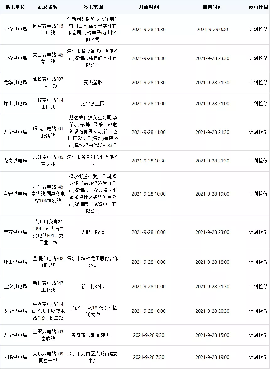根据南方电网官网通告,未来七天深圳供电线路将进行检修,届时部分地区将进行停电,请市民朋友提前做好停电准备。