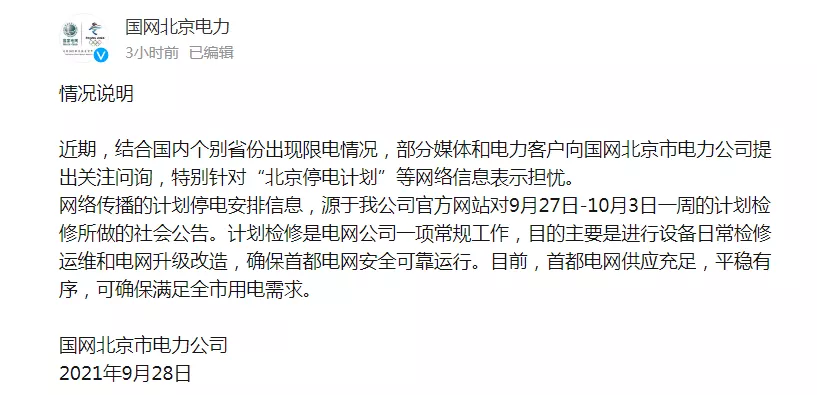 近期,结合国内个别省份出现限电情况,部分媒体和电力客户向国网北京市电力公司提出关注问询,特别针对“北京停电计划”等网络信息表示担忧。
