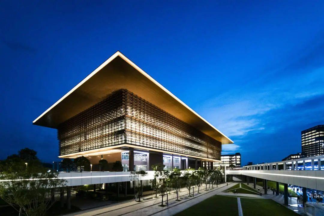图书馆提取了中国传统建筑中“单斗支替”为创作元素,用现代的设计手段重新构建,以精致的细节构造来传承经典,突显出东方艺术气质和丰富的文化内涵。
