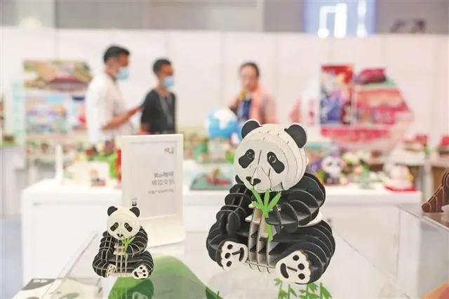 天府熊猫馆内展出憨态可掬的熊猫文创产品。