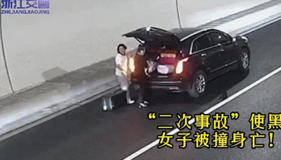 然而,黑色小车的驾驶人未意识到危险的来临,该黑衣女子在快车道内随意走动,女儿也下车,两人试图拿出被行李压在下面的三角牌。