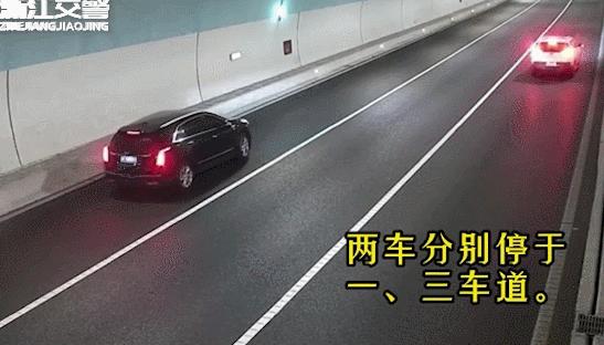 两车损失轻微,本应该快速撤离到安全地带,可他们没有这么做。黑、白小车分别停于隧道内一、三车道,不时有车辆呼啸而过,他们正处于危险之中。