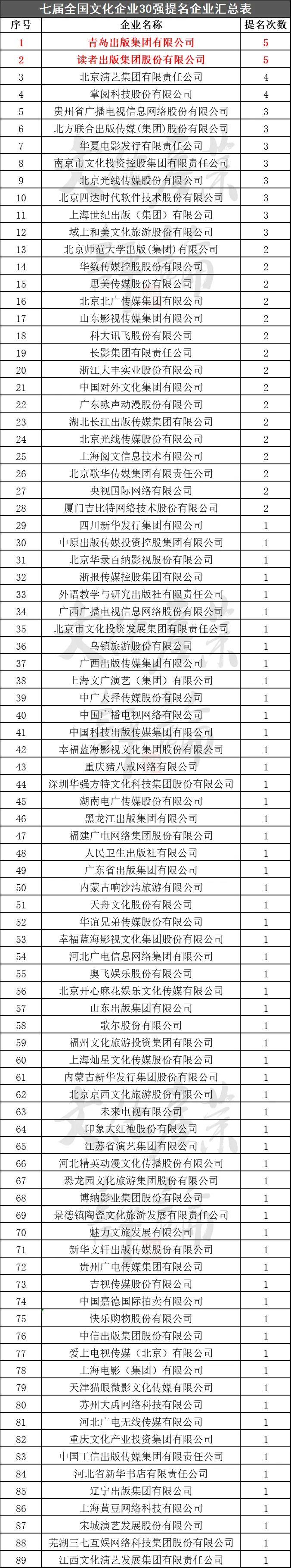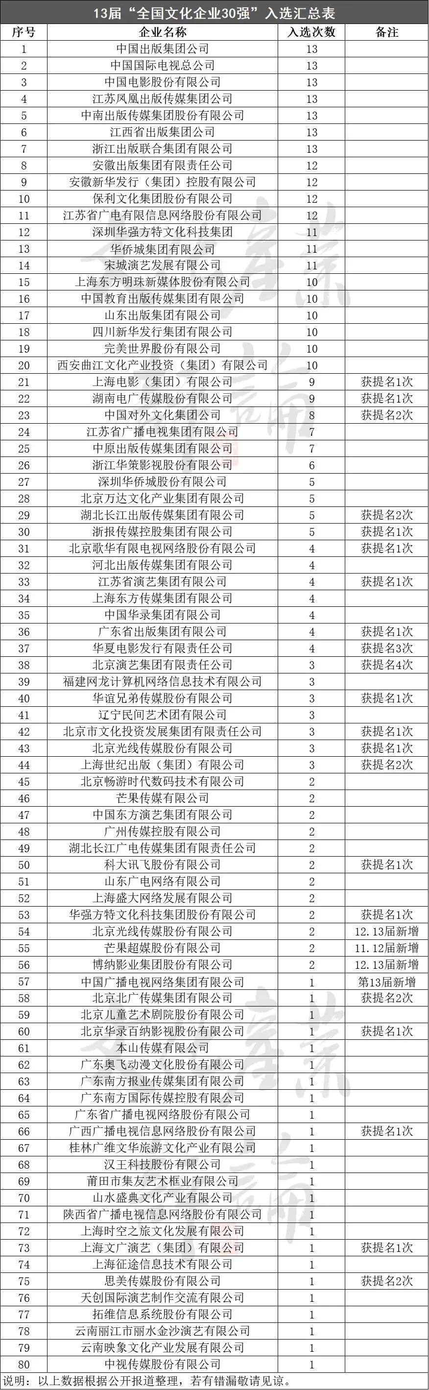 自2008年以来,光明日报社和经济日报社连续13年发布“中国文化企业30强”名单。盘点过往数据,截至目前13届评选共有80家文化企业进入“30强”名单。其中,蝉联13届的企业有7家、上榜12届的有4家、11次入选的有3家、10次入选的有6家,占总榜单文化企业25%。
