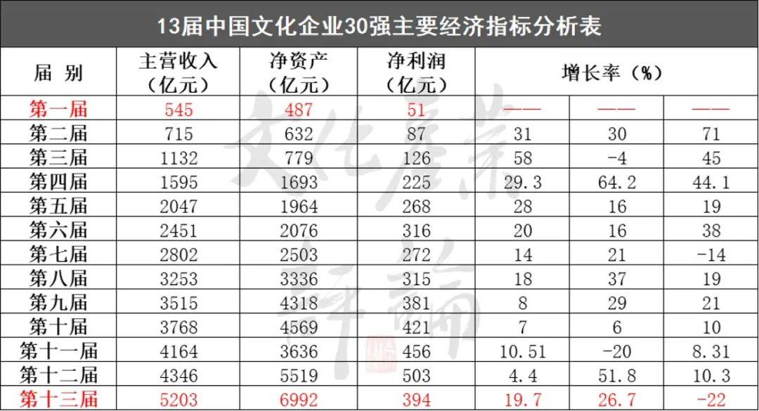 近日,光明日报社和经济日报社在中宣部召开的文化高质量发展座谈会上联合发布了第十三届“全国文化企业30强”名单。本届“30强”2020年度合计主营收入5203亿元、净资产6992亿元、净利润394亿元,主营业务收入和净资产均创历史新高,分别比上届“30强”增长19.7%和26.7%,且主营业务收入首次突破5000亿元大关,净资产首次突破6000亿元大关。同时,也标志着中国文化产业正向高质量发展阶段稳健迈进。