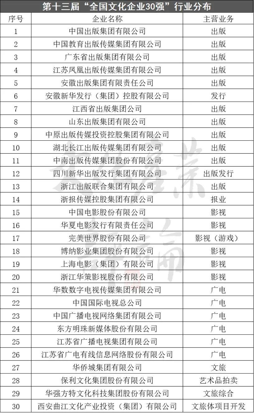 从名单的行业分布来看,本届“30强”粗略来看共涉及广播影视、出版发行、文旅综合及报业等四大类行业公司。其中,出版发行相关企业共13家上榜,广播影视相关企业共有12家入围,文旅相关企业有4家入选,报业行业仅有浙报传媒控股集团有限公司1家获选。