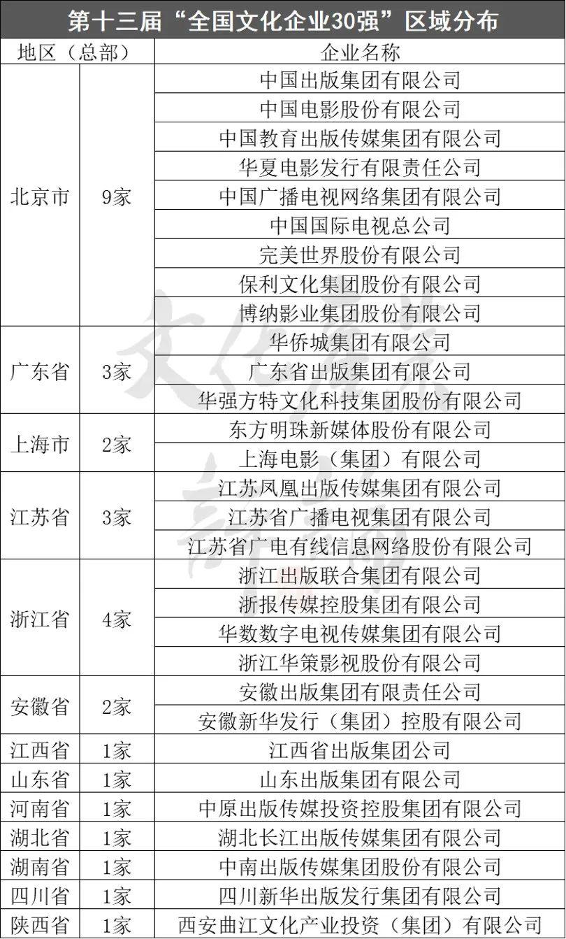 从名单的地域分布来看,北京、长三角、大湾区最多,且综合实力最强,显示出了文化产业较大的区域性差异。其中,企业总部设在北京共有9家(其中6家蝉联或10次以上入选)、浙江省共有4家、广东和江苏各3家、上海和安徽各2家,江西、山东、河南等7省分别1家入围(见下表)。