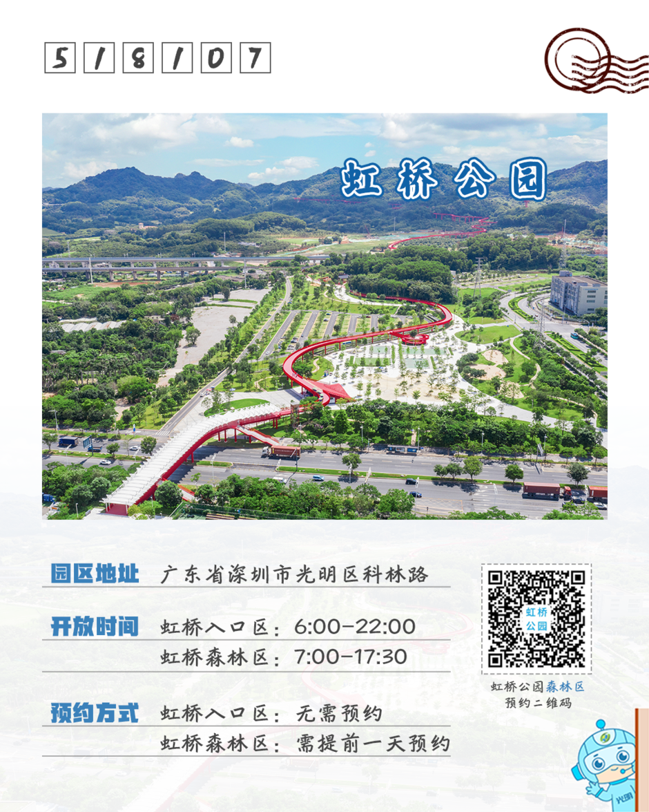 虹桥公园位于光侨路与大顶岭之间,入口区、碧湖区和森林区由一条长约4公里的红色空中栈桥串联。