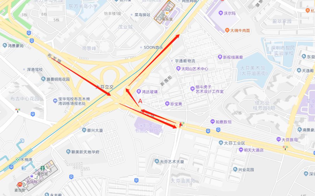 原经大芬立交桥1#桥(龙岗大道转布龙路转北匝道)路段通行的车辆,可改沿吉华路、铁东路、布沙路(红绿灯口调头)、龙岗大道佳兆业桂芳园(红绿灯路口调头)或周边其他道路通行。