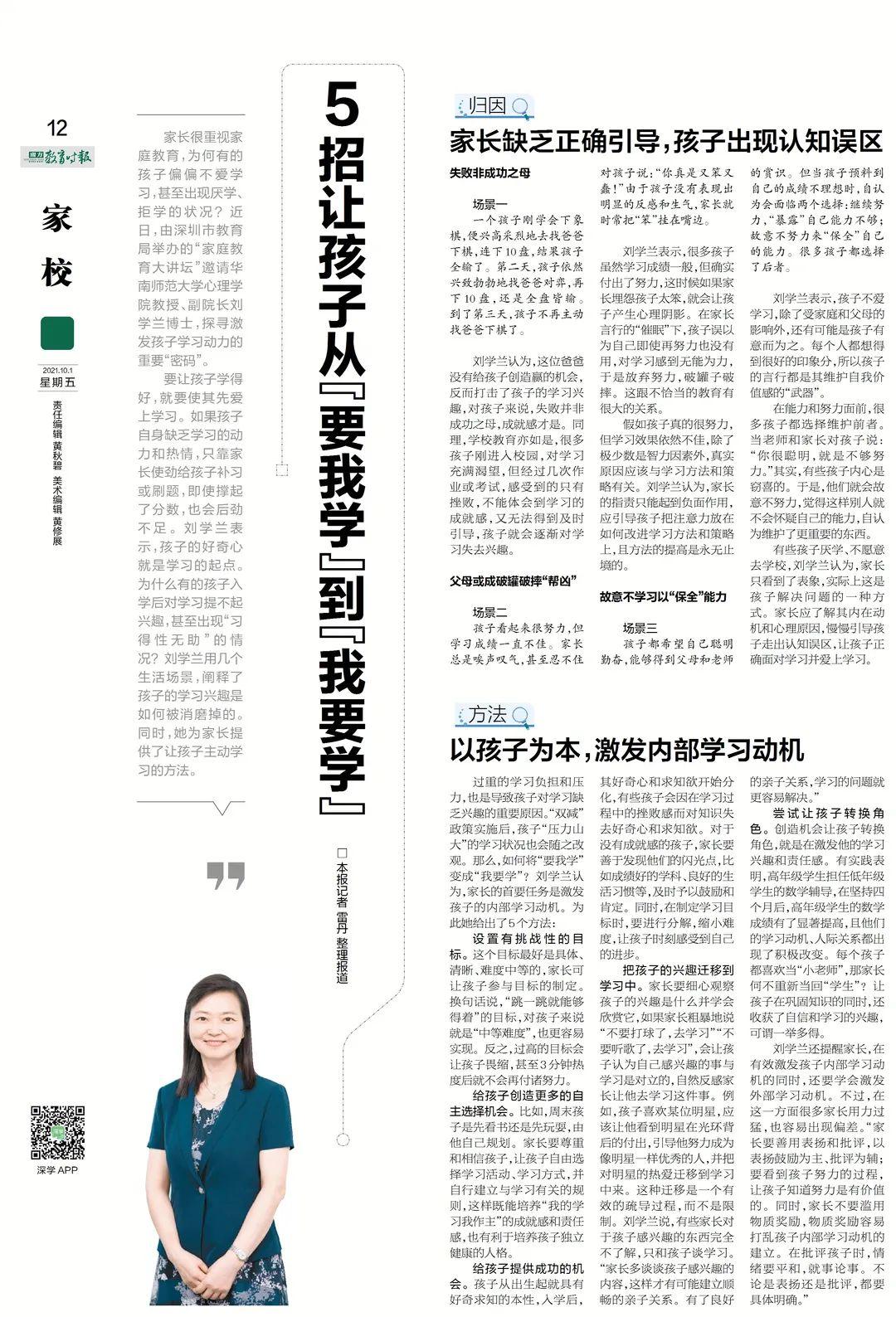 家长很重视家庭教育,为何有的孩子偏偏不爱学习,甚至出现厌学、拒学的状况?近日,由深圳市教育局举办的“家庭教育大讲坛”邀请华南师范大学心理学院教授、副院长刘学兰博士,探寻激发孩子学习动力的重要“密码”。