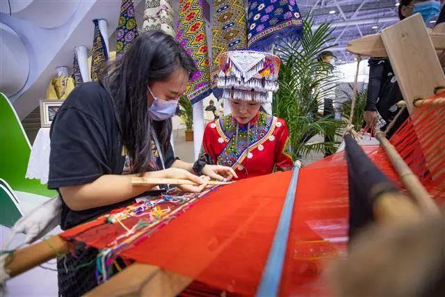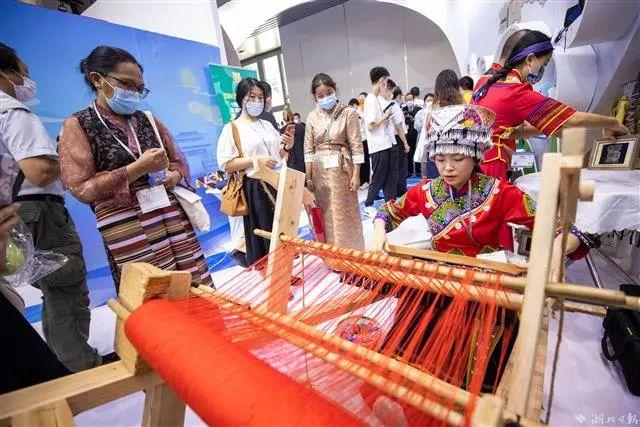 本届文博会湖北馆展出的实物展品共800余件(套),在现场刊播的各类图片、音视频展品100多部。平潭海峡大桥模型、空中造楼机模型、光纤预制棒模型、智能网联汽车等大型展品,“越王勾践剑”“鹿角立鹤”等湖北省博物馆文化高仿系列展品,建党百年、抗击疫情系列图书,土家传统西兰卡普、天然大漆漆器文创茶具等,均吸引了大量游客现场驻足欣赏或咨询、体验。